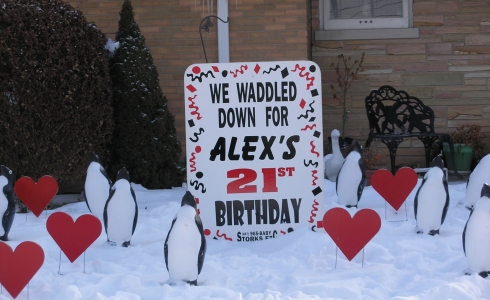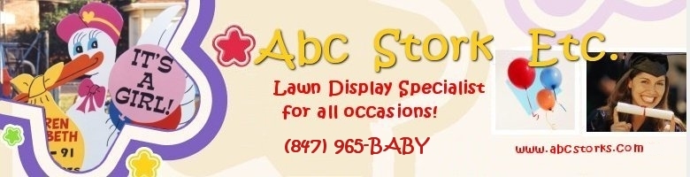 Since 1993. ABC Stork Etc. has been serving Chicago Metropolitan area for all celebration display needs. Our goal is to provide the largest selection of stork lawn displays, custom displays, Chicago Chicagoland, Girl Stork, Boy Stork, sign, Party Lawn Sign, Stork Rental, Lawn Rental, Party Signs, Birthday lawn sign, Lawn Sign, Lawn Display, Anniversary, Graduation, Wedding, Engagement, Keep sake bundle, Flamingo Lawn Display, Cow Lawn Display, Dinosaur Lawn Display, Penguin Lawn Display, Pink Elephant Lawn Display, Frog Lawn Display, Pink Flamingo Lawn Display, Baby Stork, Outside Decorations, Balloons, Celebration Decorations, Celebration Lawn Signs, Adult Birthday display, Children Birthday Display, Sweet 16 Birthday display, Stork Birth announcement sign